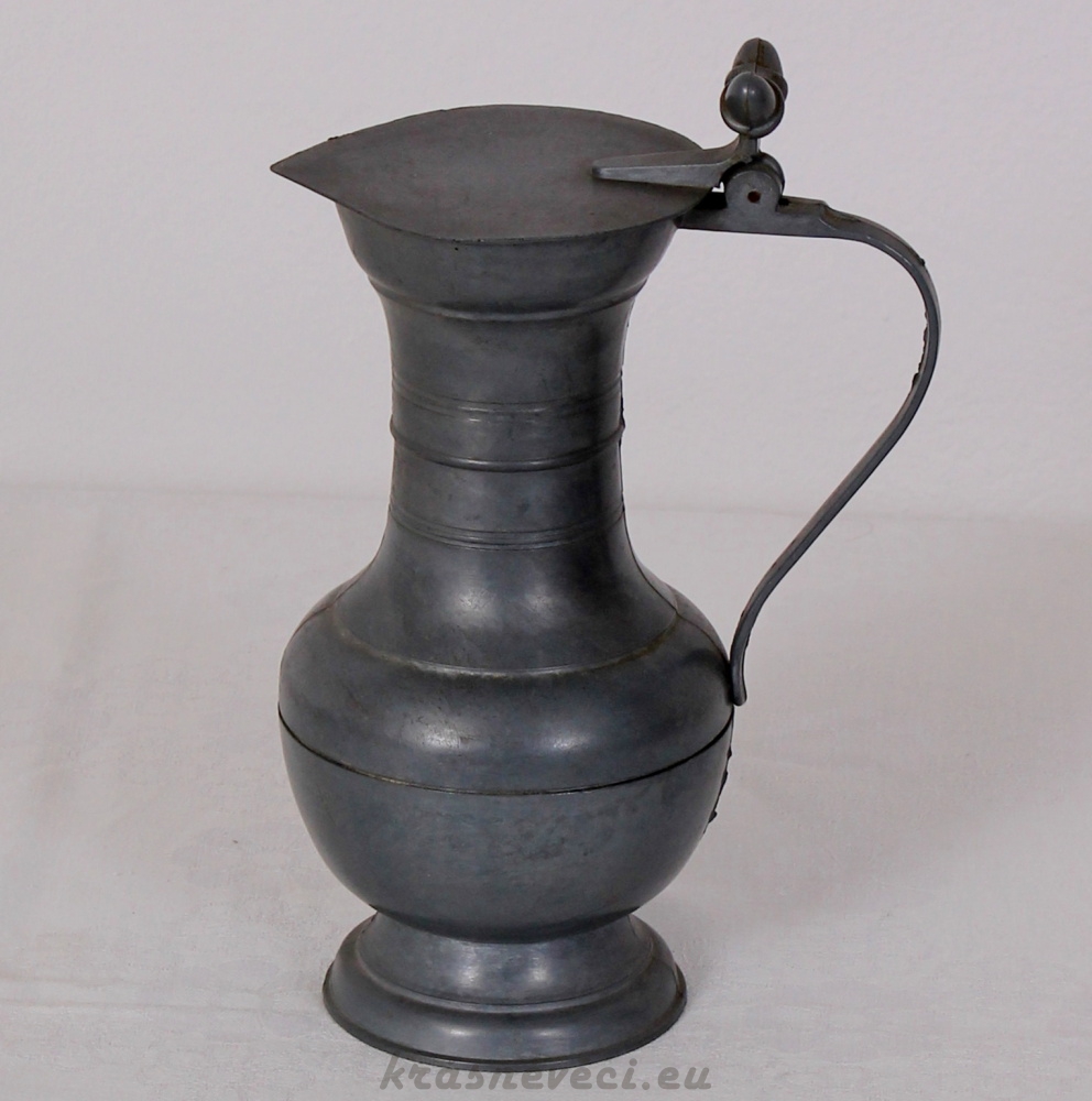 Velmi pěkný cínový korbel s otvíracím víkem a ouškem, dekorace.