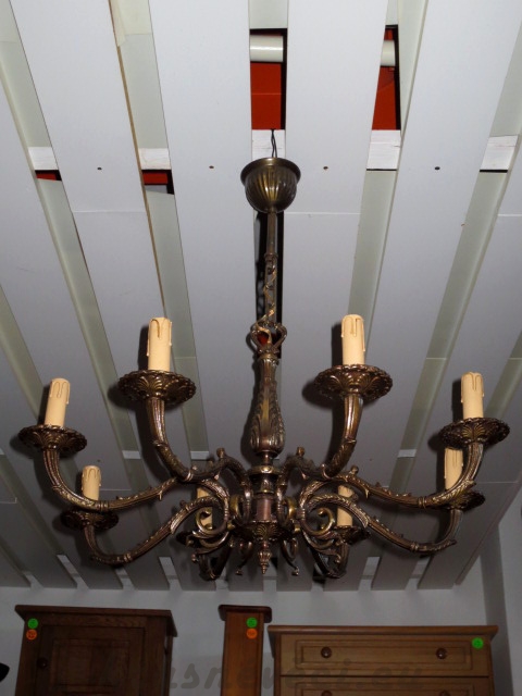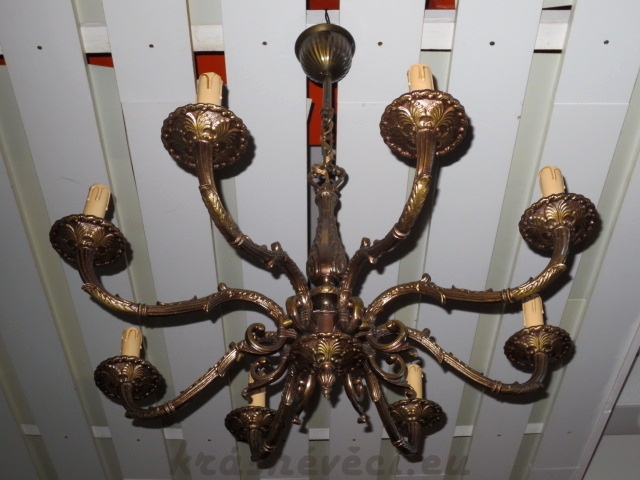 Velmi pěkný exklusivní 8 ramenný mosazný lustr na řetězu se zdobením. Možnost zkrácení celkové výšky lustru odebráním oček řetězu.