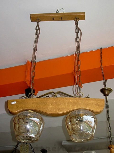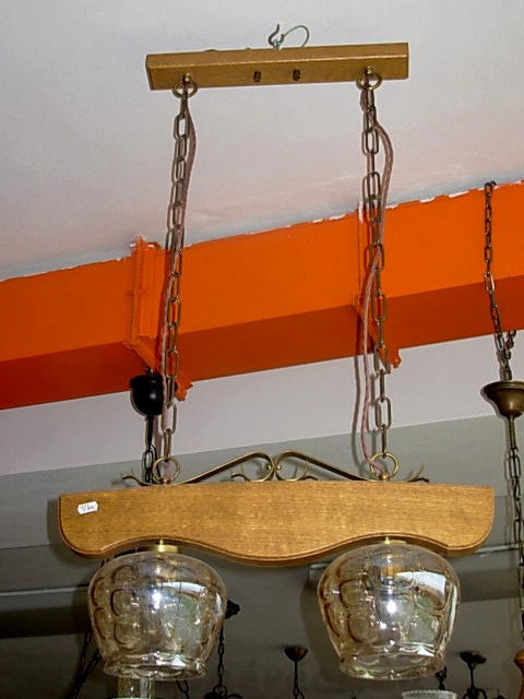 Velmi pěkný stylový 2 ramenný lustr na řetězu s dubovou konstrukcí a skleněnými stínidly. Možnost zkrácení celkové výšky lustru odebráním oček řetězu.