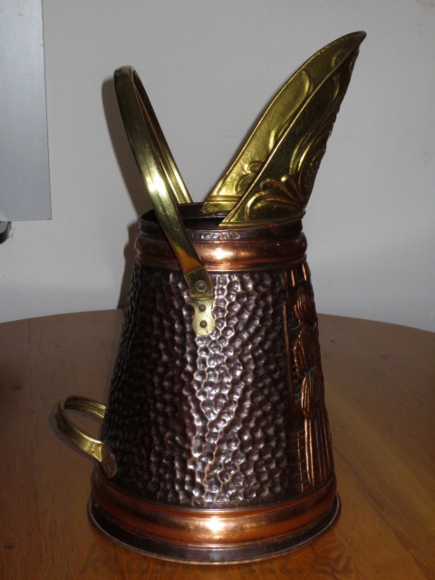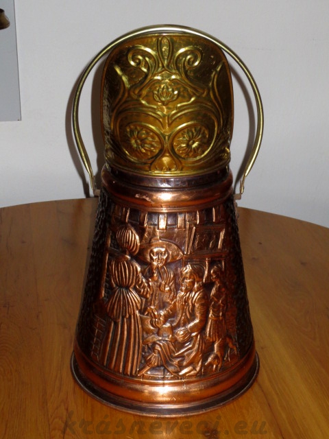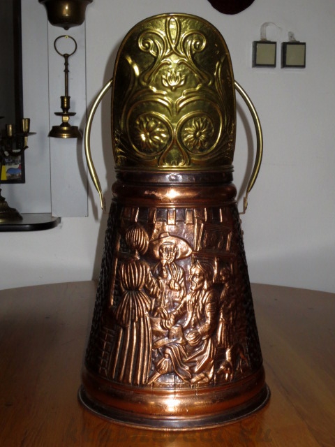Velmi pěkná velká měděná nádoba se zdobením, 2 mosaznými oušky a mosaznou nálevkou.