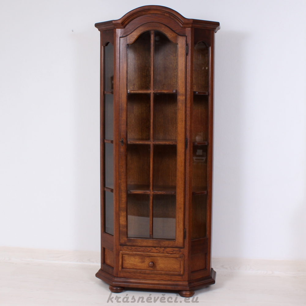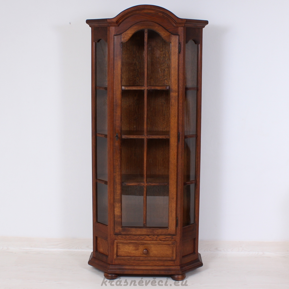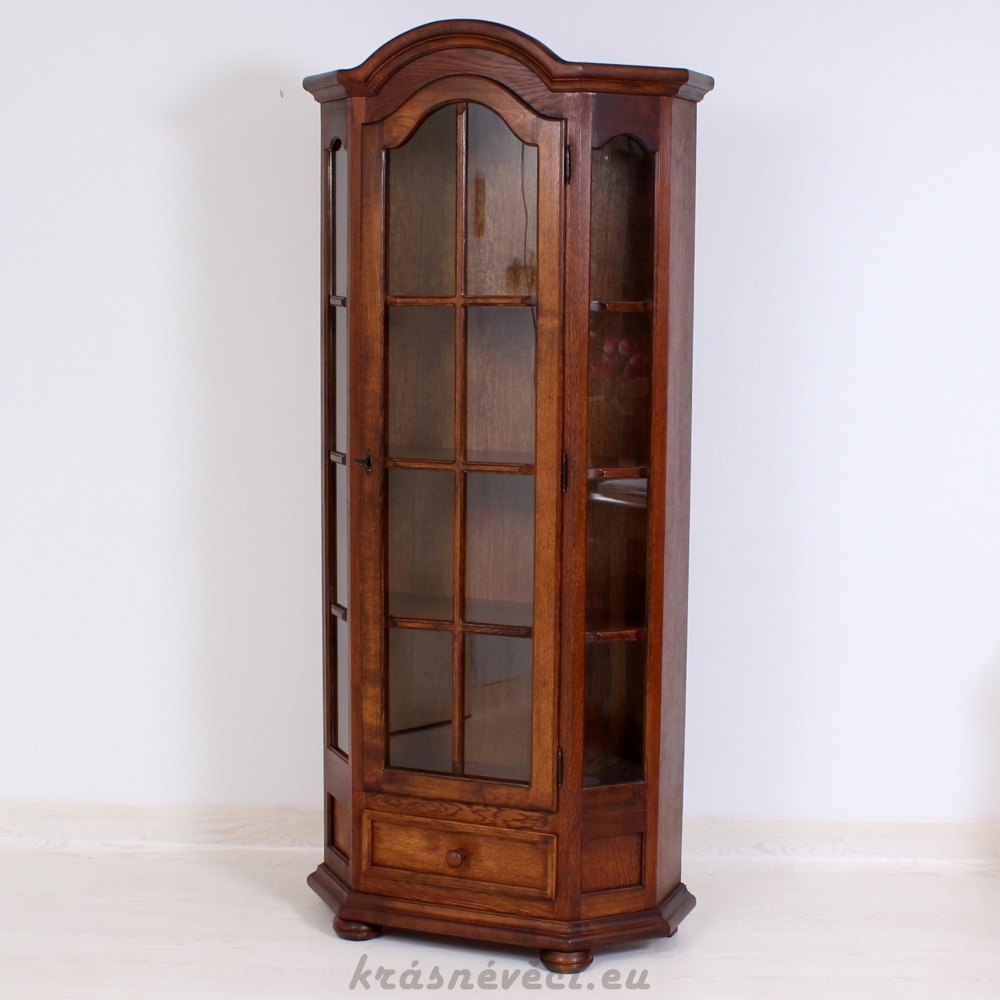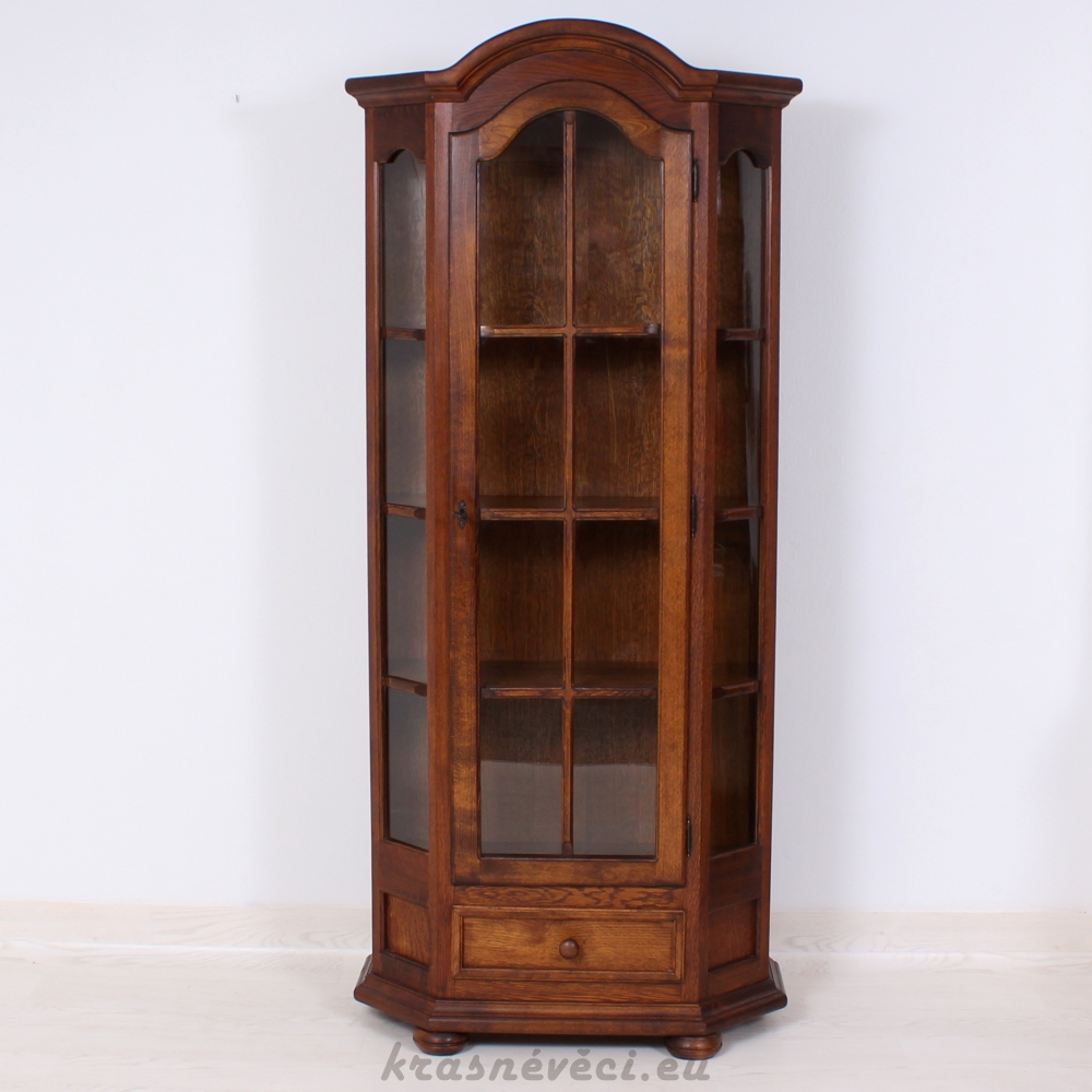 Velmi pěkná vitrína, 1x dvířka se sklem a zamykáním, 2x boční skla, 1x šuplík.