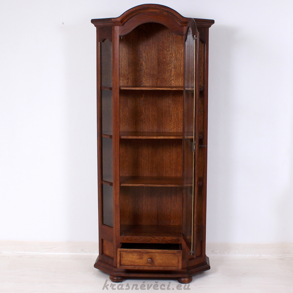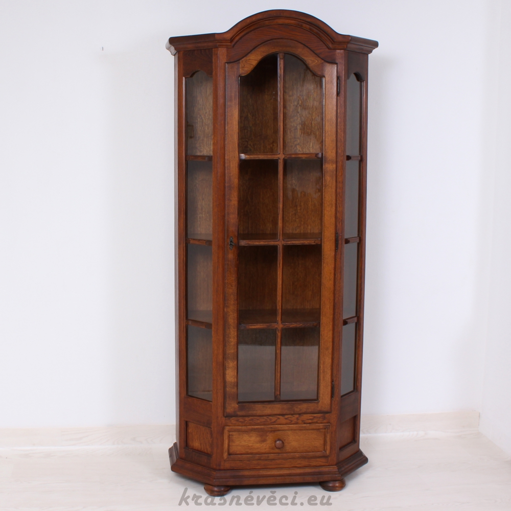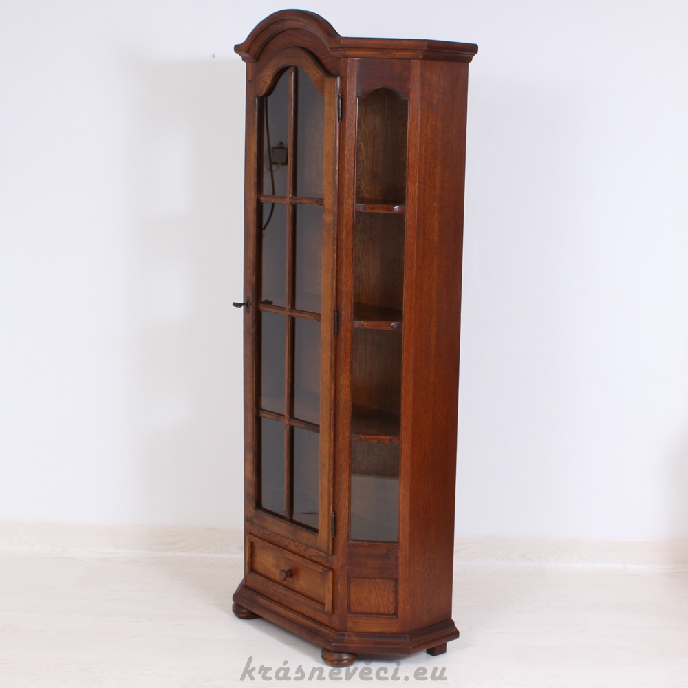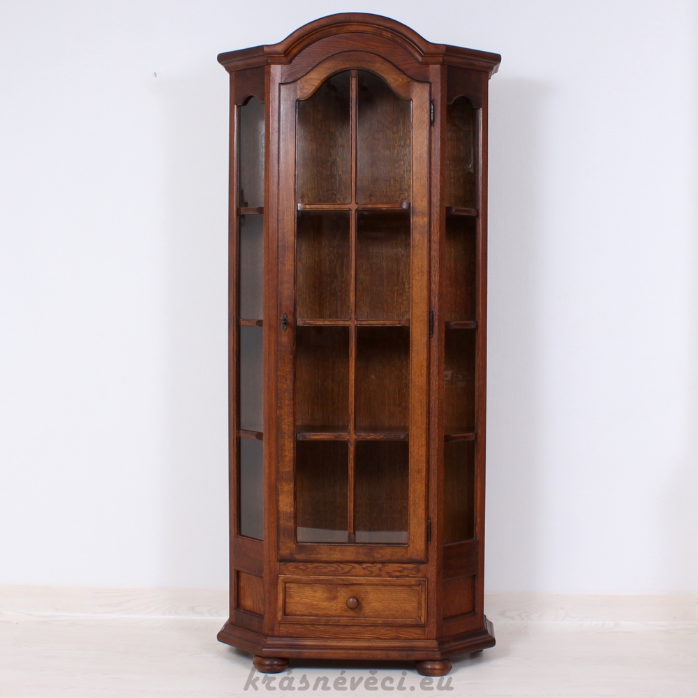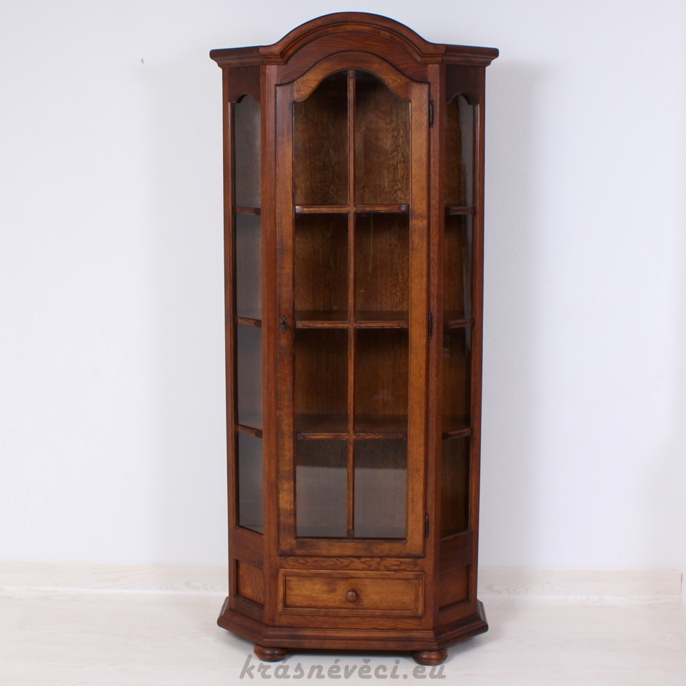 Velmi pěkná vitrína, 1x dvířka se sklem a zamykáním, 2x boční skla, 1x šuplík.