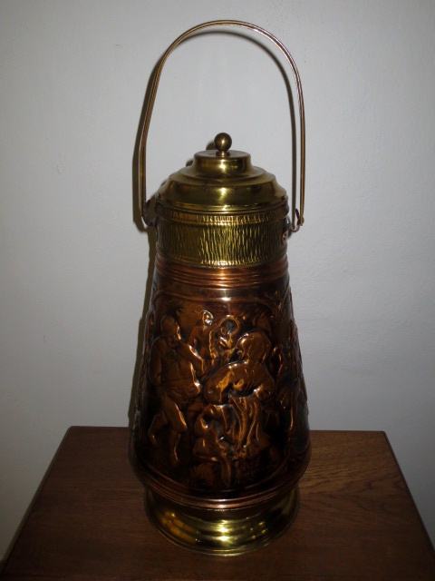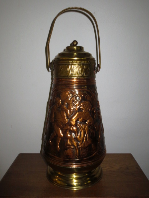 Velmi pěkná exklusivní měděná nádoba se zdobením a kombinací s mosazí, mosazné víko a ouško.