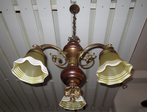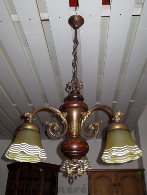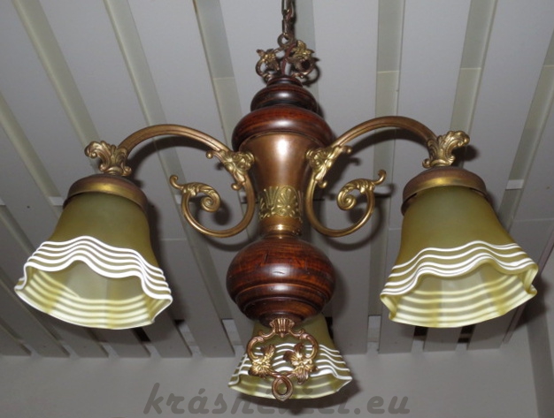 Velmi pěkný exklusivní 3 ramenný lustr na řetězu se dřevem, mosazným zdobením a zajímavým sklem. Možnost zkrácení celkové výšky lustru odebráním oček řetězu.