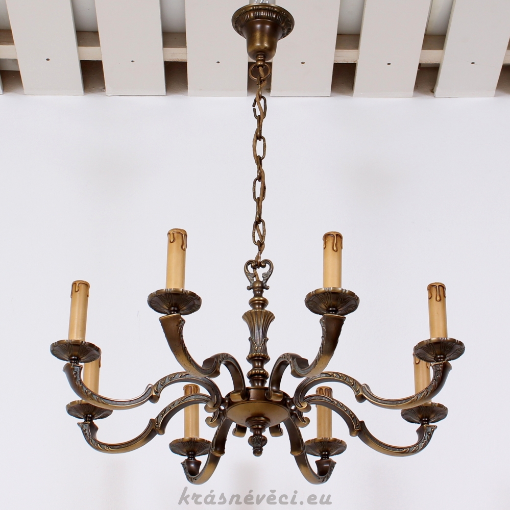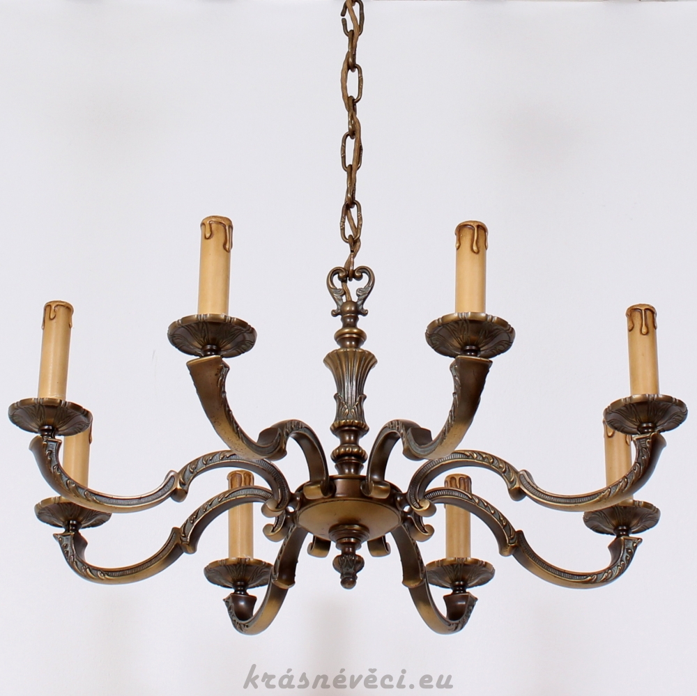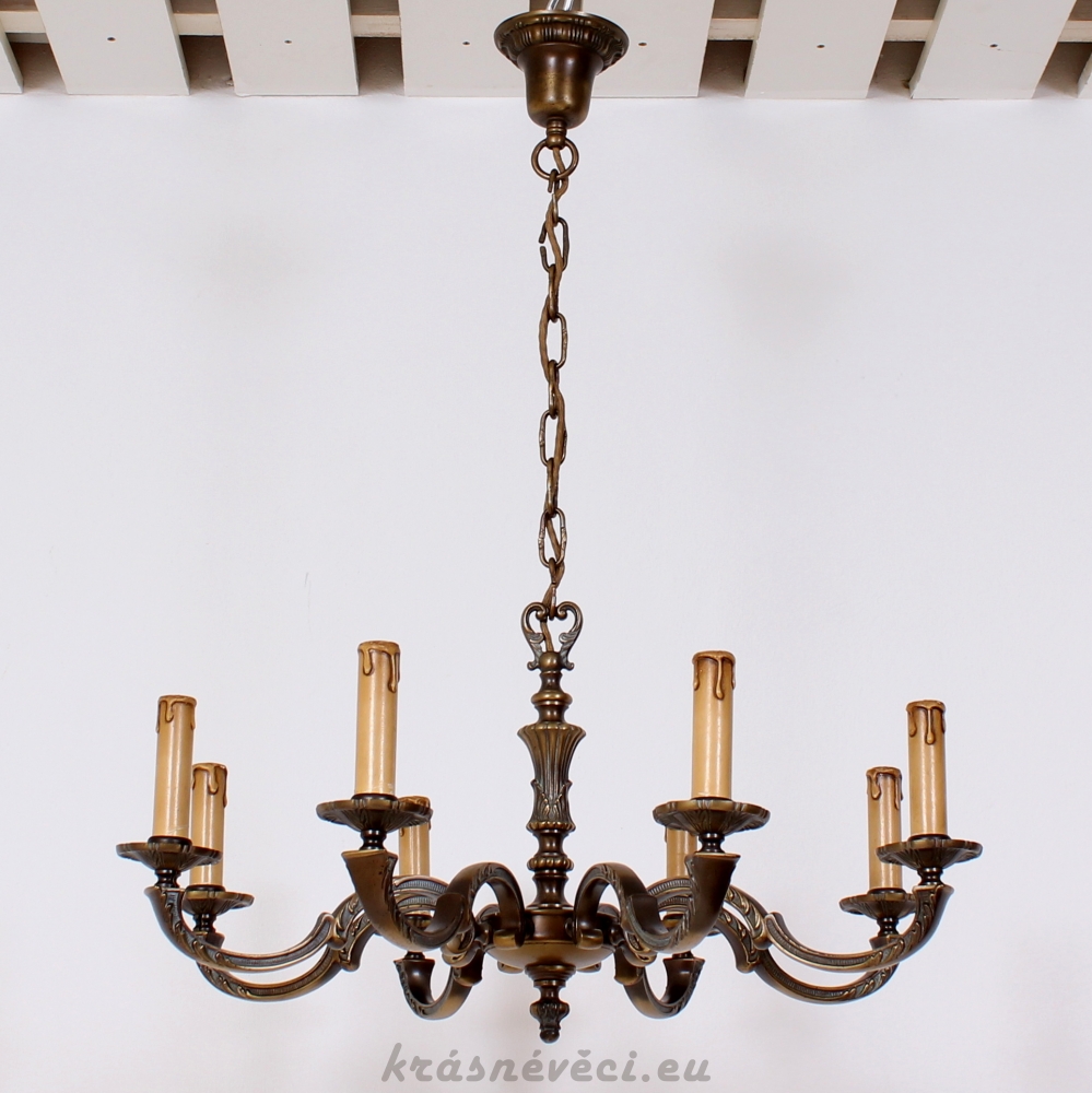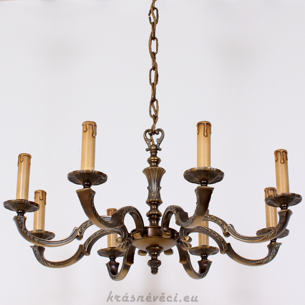 Velmi pěkný exklusivní 8 ramenný bronzový lustr na řetězu se zdobením. Možnost zkrácení celkové výšky lustru odebráním oček řetězu.