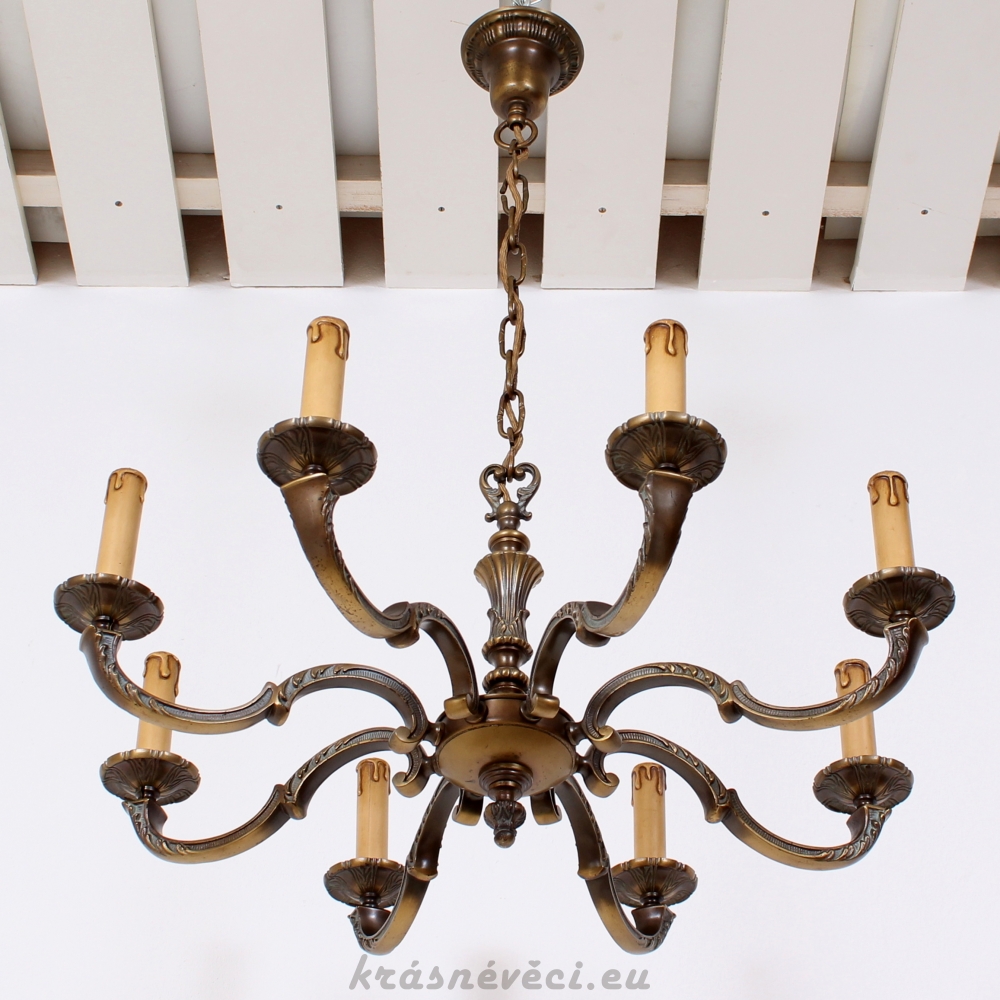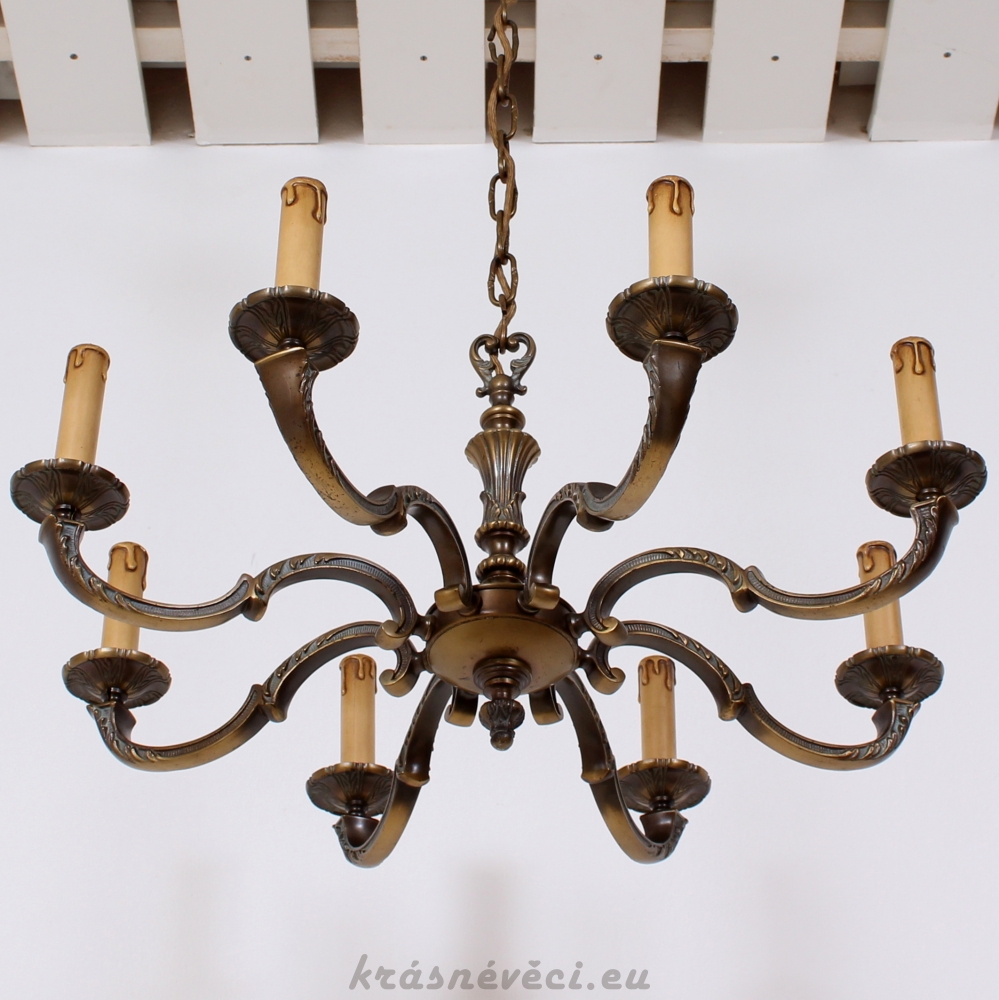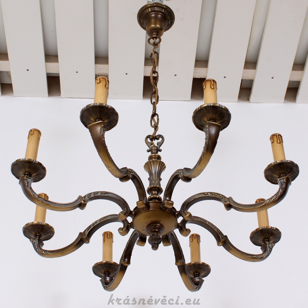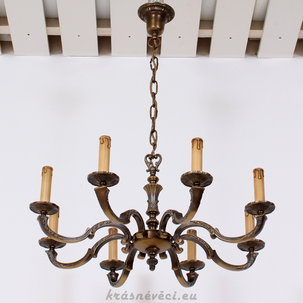 Velmi pěkný exklusivní 8 ramenný bronzový lustr na řetězu se zdobením. Možnost zkrácení celkové výšky lustru odebráním oček řetězu.