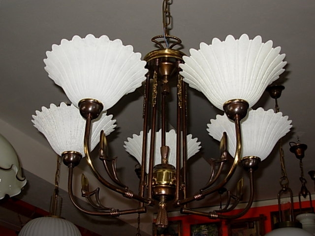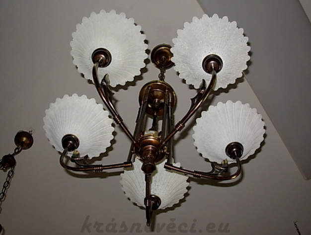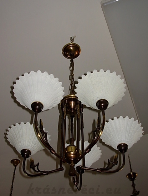 Velmi pěkný 5 ramenný mosazný lustr na řetězu se zdobením. Možnost zkrácení celkové výšky lustru odebráním oček řetězu.