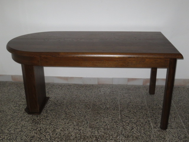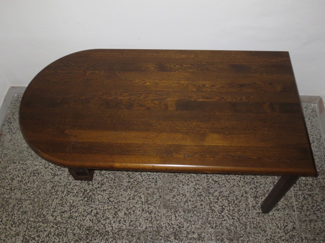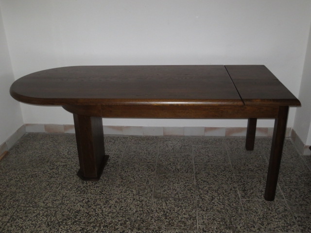 Velmi pěkný exklusivní dubový rozkládací stůl. 1 strana s obloukem, 1 strana rovná, 3 nohy.