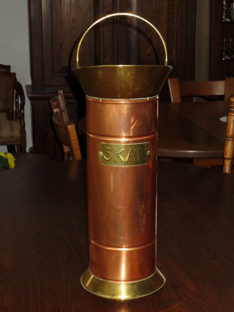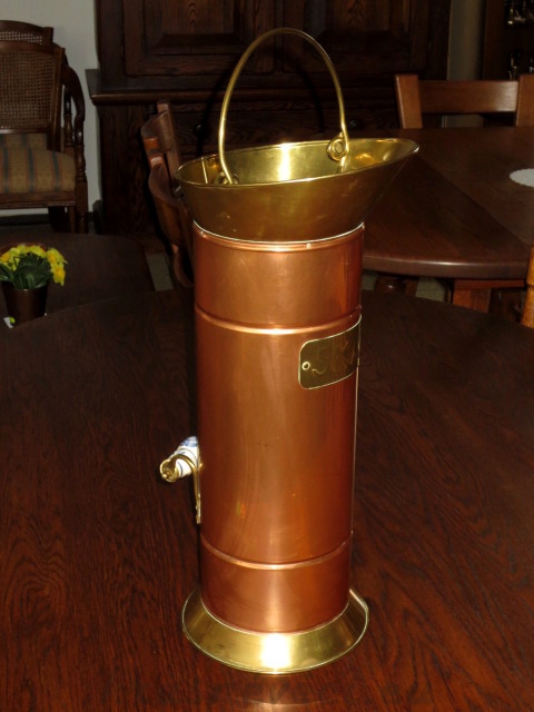 Velmi pěkná exklusivní velká měděná nádoba 5KAN s mosaznou nálevkou, 1 mosazným ouškem a 1 ouškem s ručně malovanou keramikou.