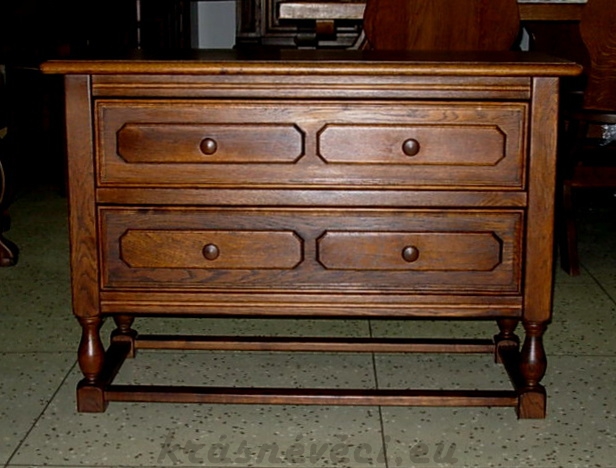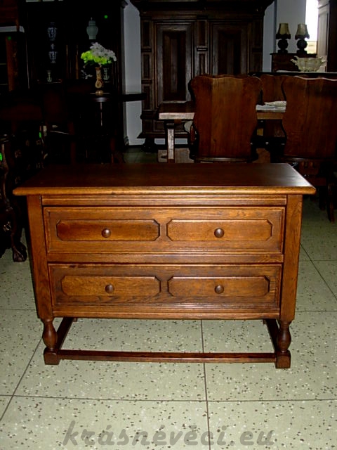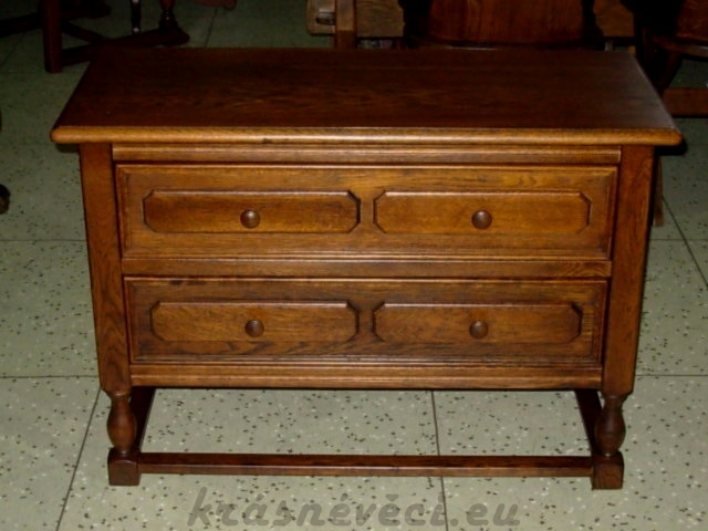 Velmi pěkná komoda na 4 nožkách se 2 šuplíky a zdobením.