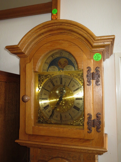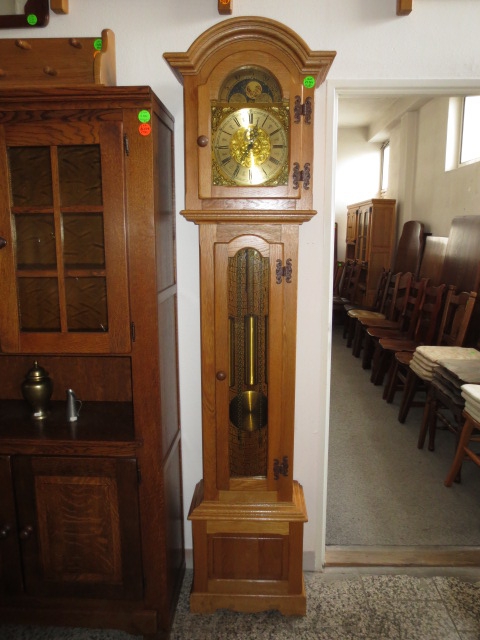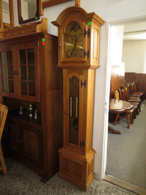 Velmi pěkné exklusivní sloupové mechanické hodiny, konstrukce - masiv dub světlý, čtvrtky, 3x závaží. Strojek s měsíční fází a vteřinovkou, vypínání melodie a odbíjení, zeslabení intenzity zvuku. Každou 1/4 hodinu hraní melodie, každou celou hodinu odbíjení dle času.