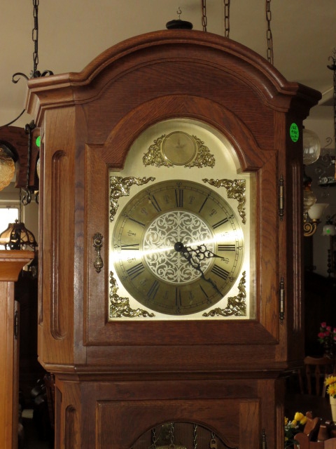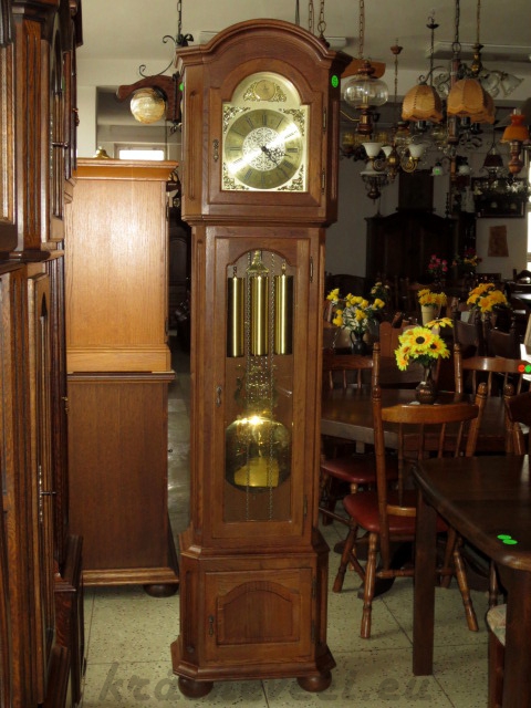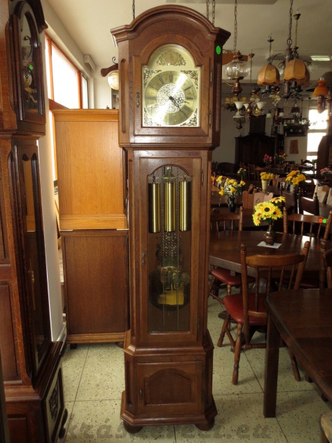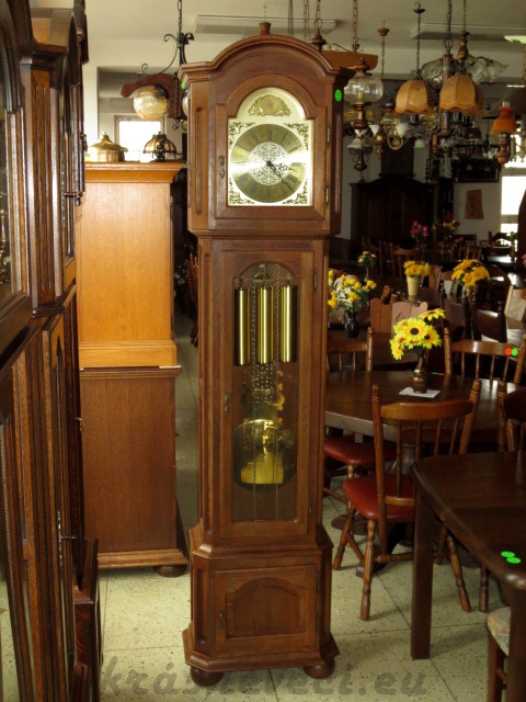 Velmi pěkné exklusivní sloupové mechanické hodiny, konstrukce masiv dub tmavý, 3x mosazné závaží s kyvadlem, čtvrtky. Každou 1/4 hodinu hraní melodie, každou celou hodinu odbíjení dle času.