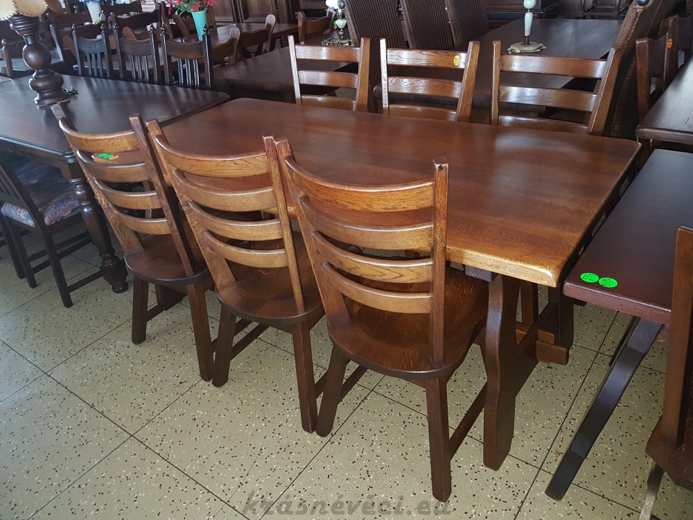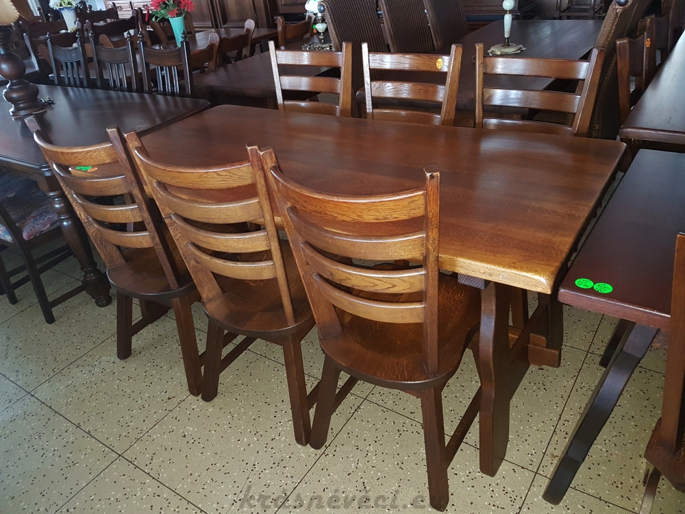 Velmi pěkný exklusivní kuchyňský set. Stůl dubový obdelníkový, 2+2 nohy spojené spojovací deskou s klíny + 6 kusů celodubových pohodlných židlí. Vše 100% MASIV DUB.