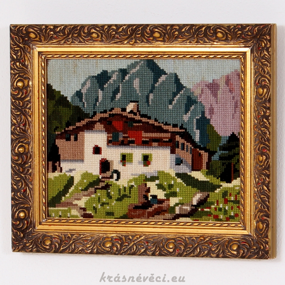 Velmi pěkný obraz - výšivka ve zlatém dřevěném řezbovaném rámu.
