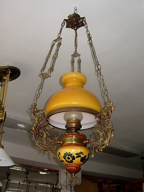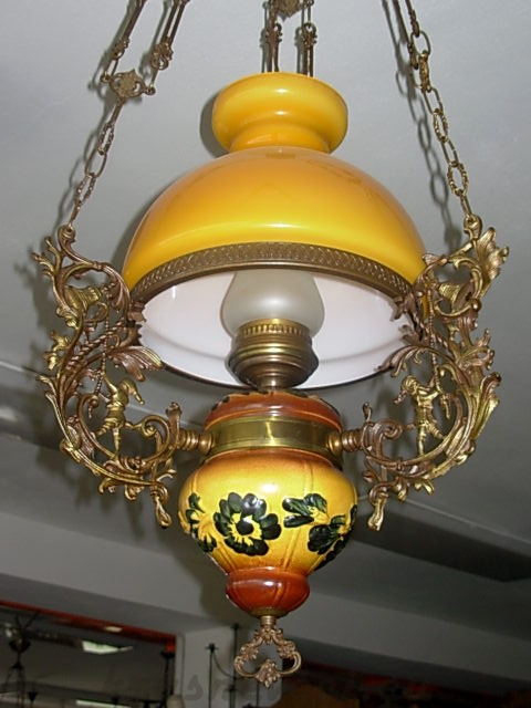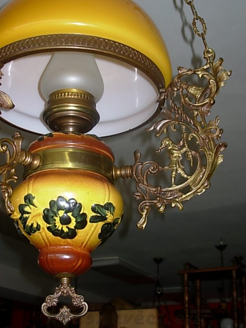 Velmi pěkný stylový lustr na řetězu s bohatým mosazným zdobením a ručně malovanou keramikou, velký a mohutný lustr. Možnost zkrácení celkové výšky lustru odebráním oček řetězu.