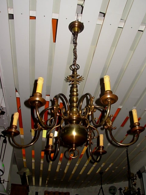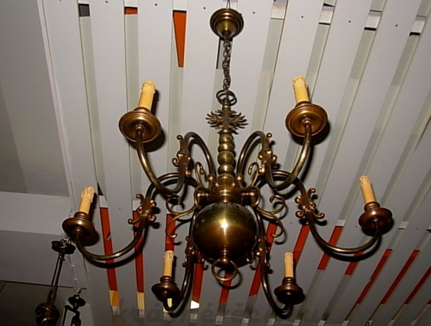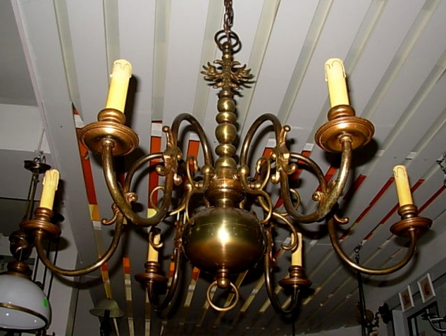 Velmi pěkný velký 6 ramenný mosazný vlámský lustr na řetězu. Možnost zkrácení celkové výšky lustru odebráním oček řetězu.
