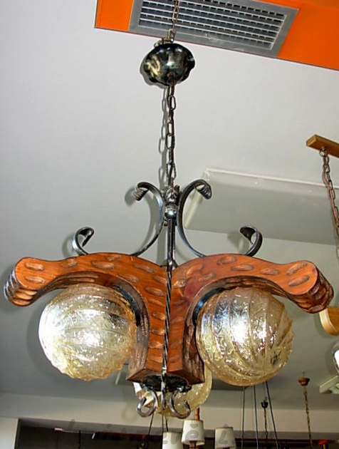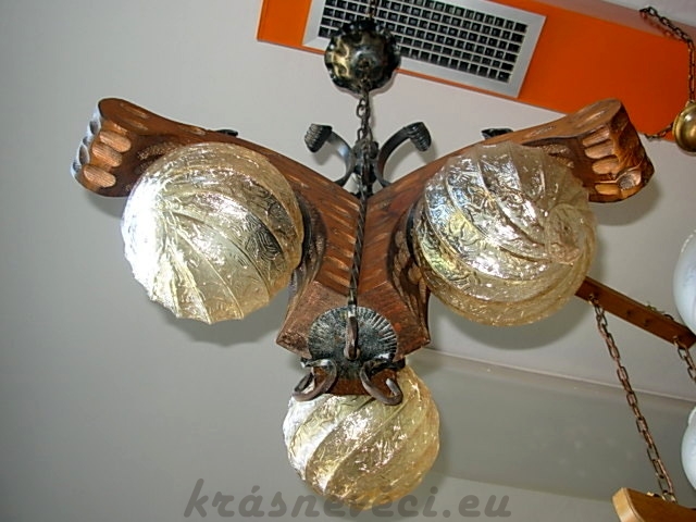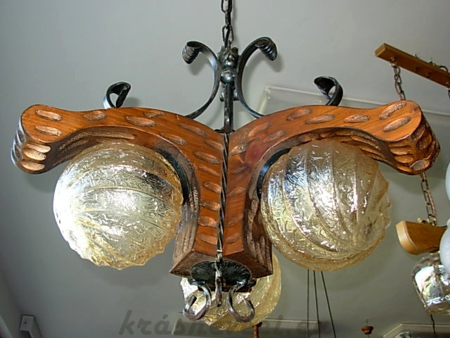 Velmi pěkný exklusivní 3 ramenný lustr na řetězu s masivní dubovou konstrukcí a kováním. Možnost zkrácení celkové výšky lustru odebráním oček řetězu.