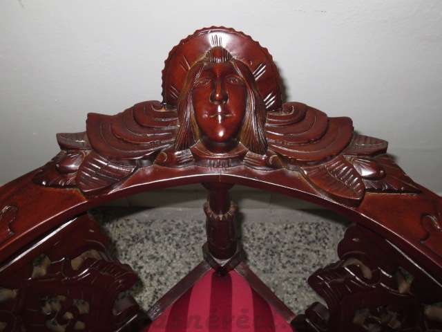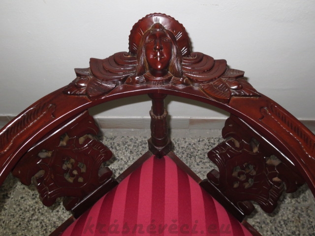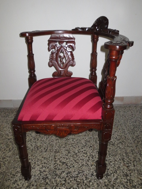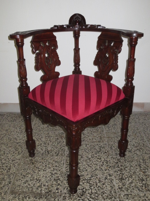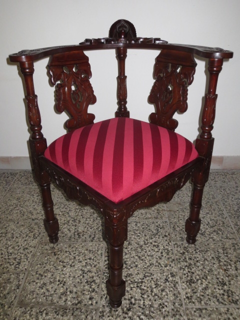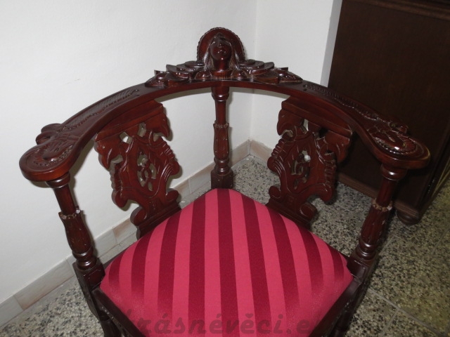 Velmi pěkné exklusivní rohové řezbované křeslo se zajímavým čalouněním.