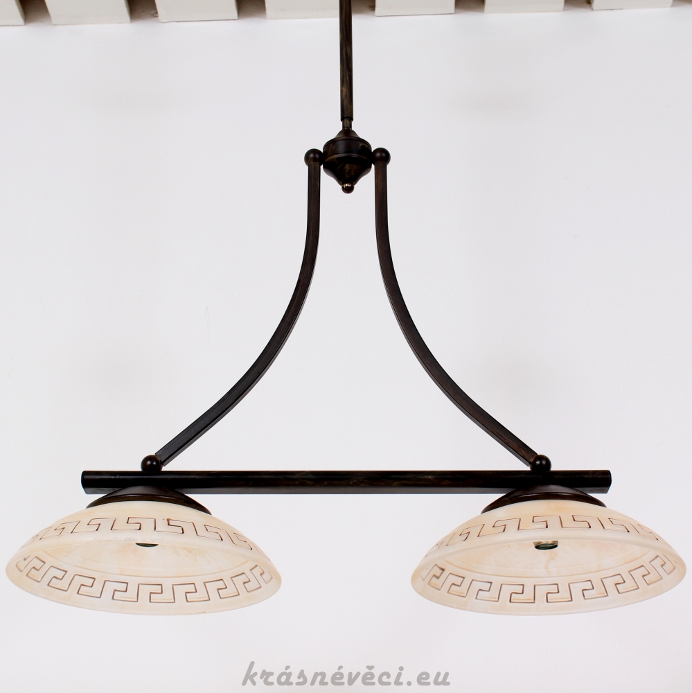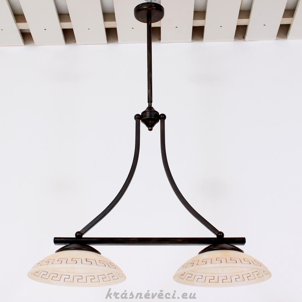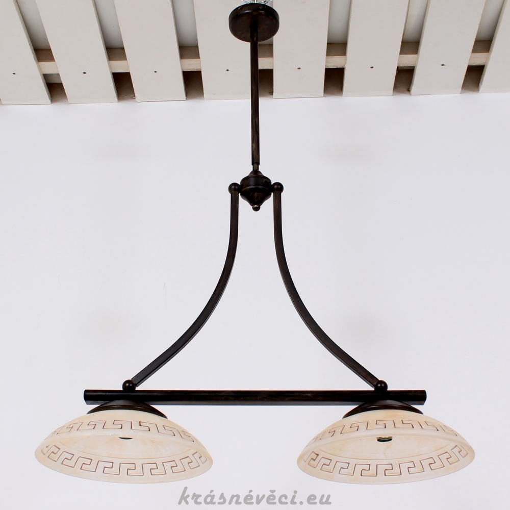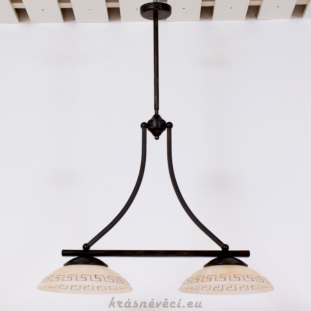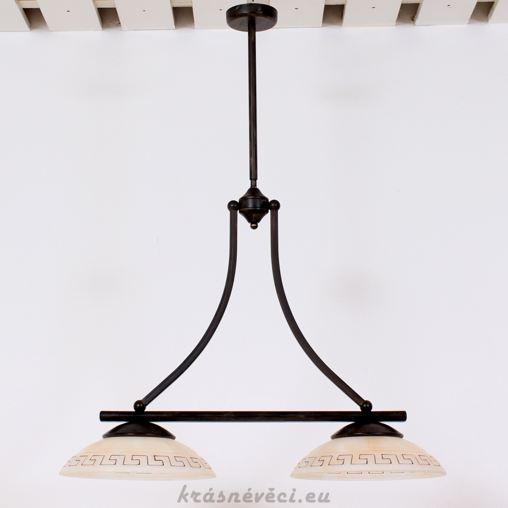 Velmi pěkný exklusivní 2 ramenný lustr s kovovou konstrukcí a žíhaným rustikálním sklem.