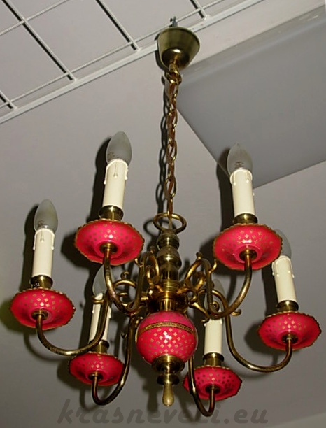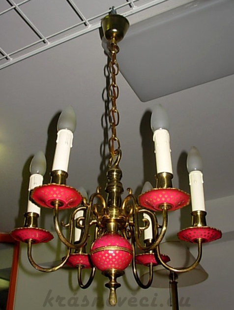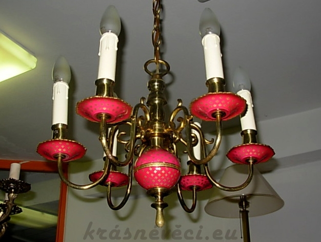 Velmi pěkný mosazný 6 ramenný lustr na řetězu s bohatým barevným zdobením. Možnost zkrácení celkové výšky lustru odebráním oček řetězu.