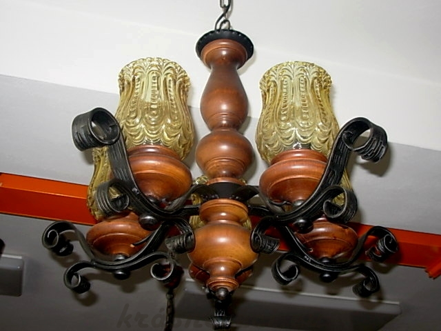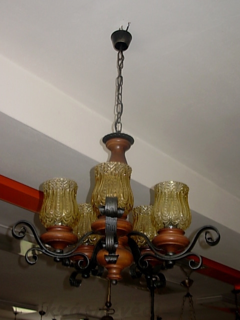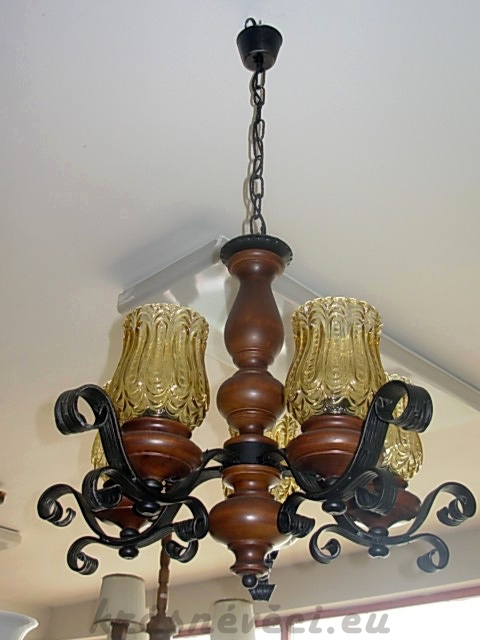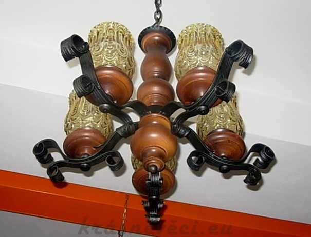 Velmi pěkný stylový 5 ramenný lustr na řetězu s dřevěnou konstrukcí, kovem a sklem. Možnost zkrácení celkové výšky lustru odebráním oček řetězu.