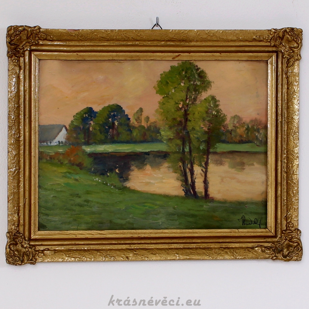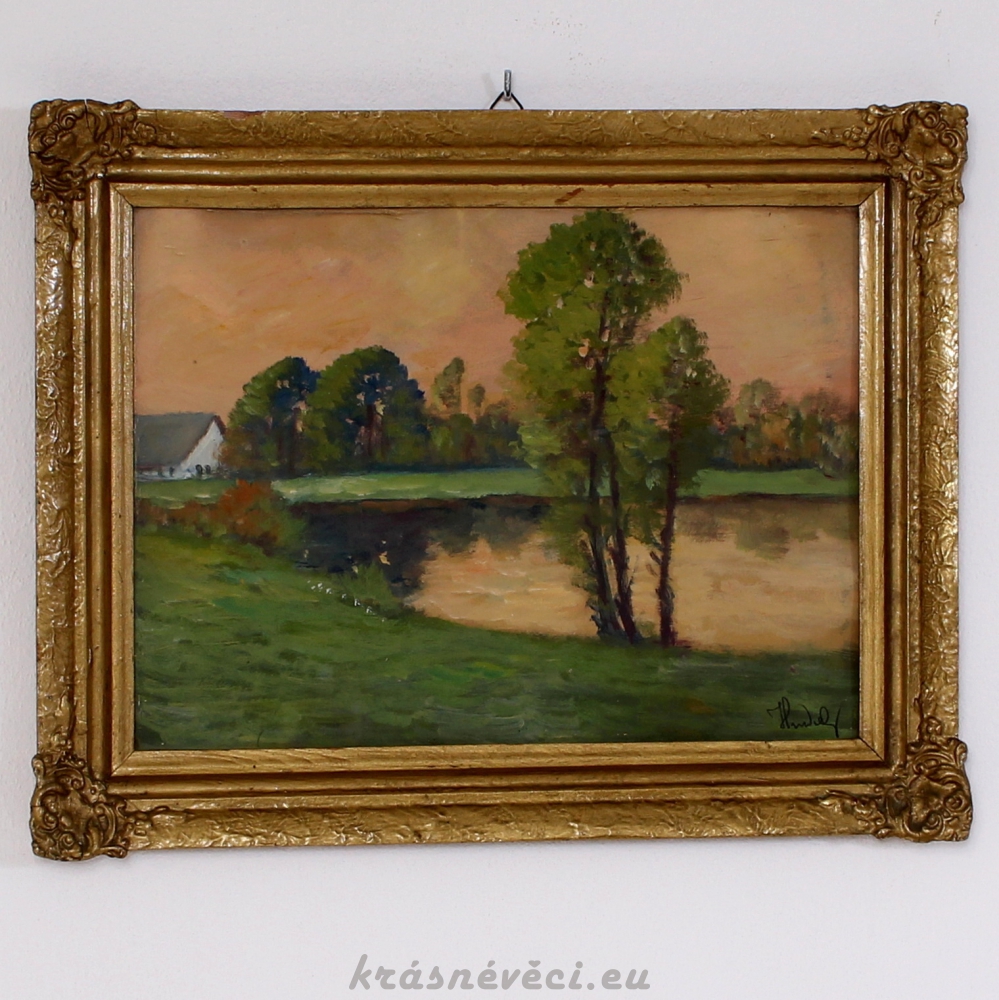 Velmi pěkný obraz ve zlatém dřevěném řezbovaném rámu, olej. Obraz je zasklen.