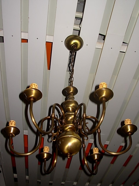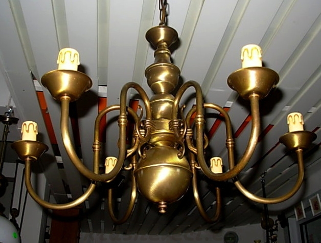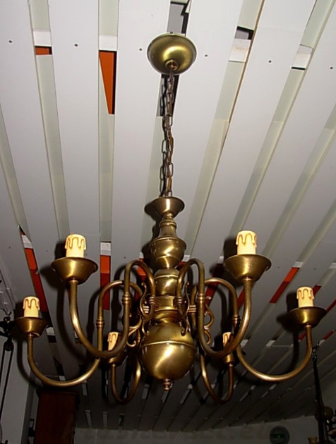 Velmi pěkný 6 ramenný mosazný lustr na řetězu. Možnost zkrácení celkové výšky lustru odebráním oček řetězu.