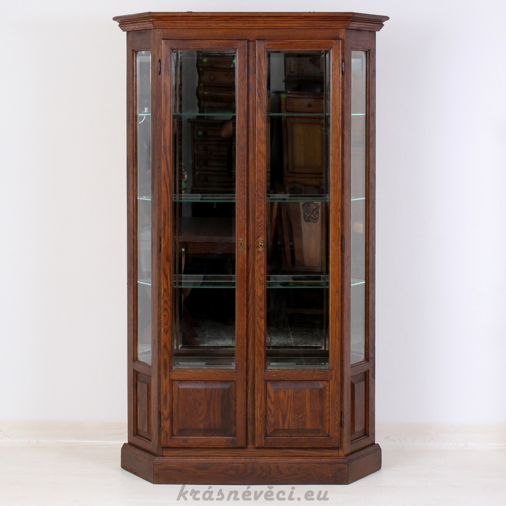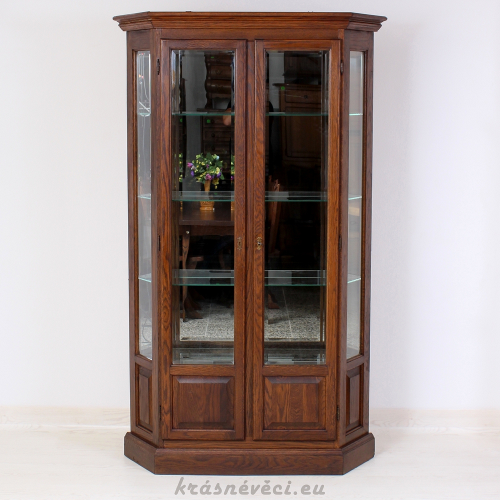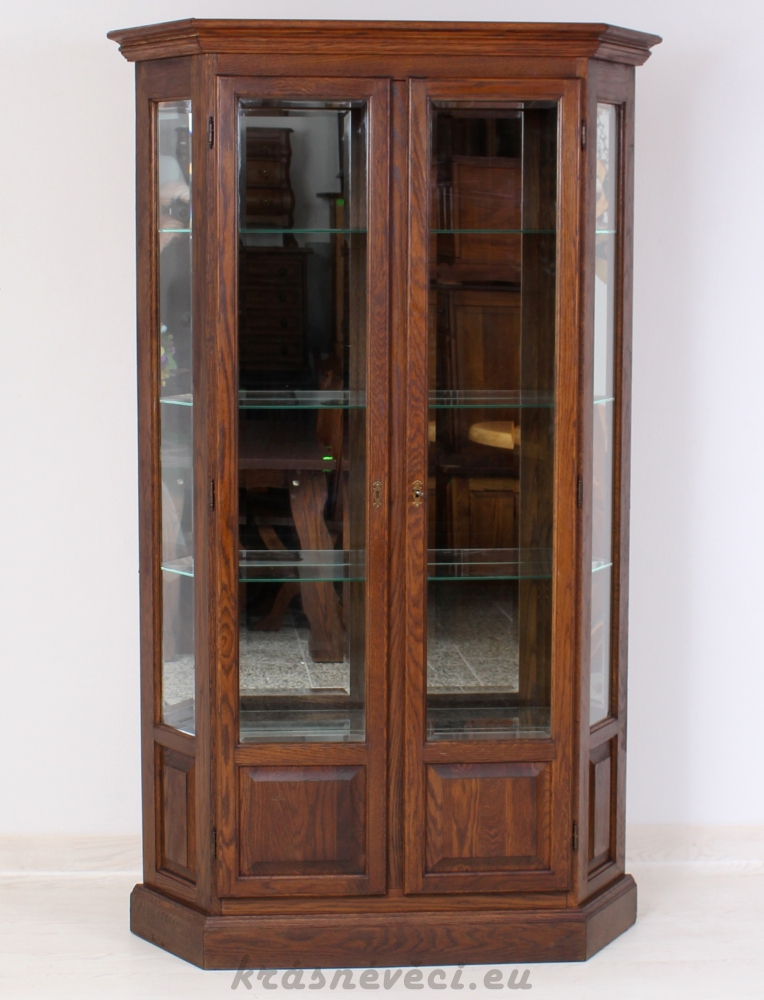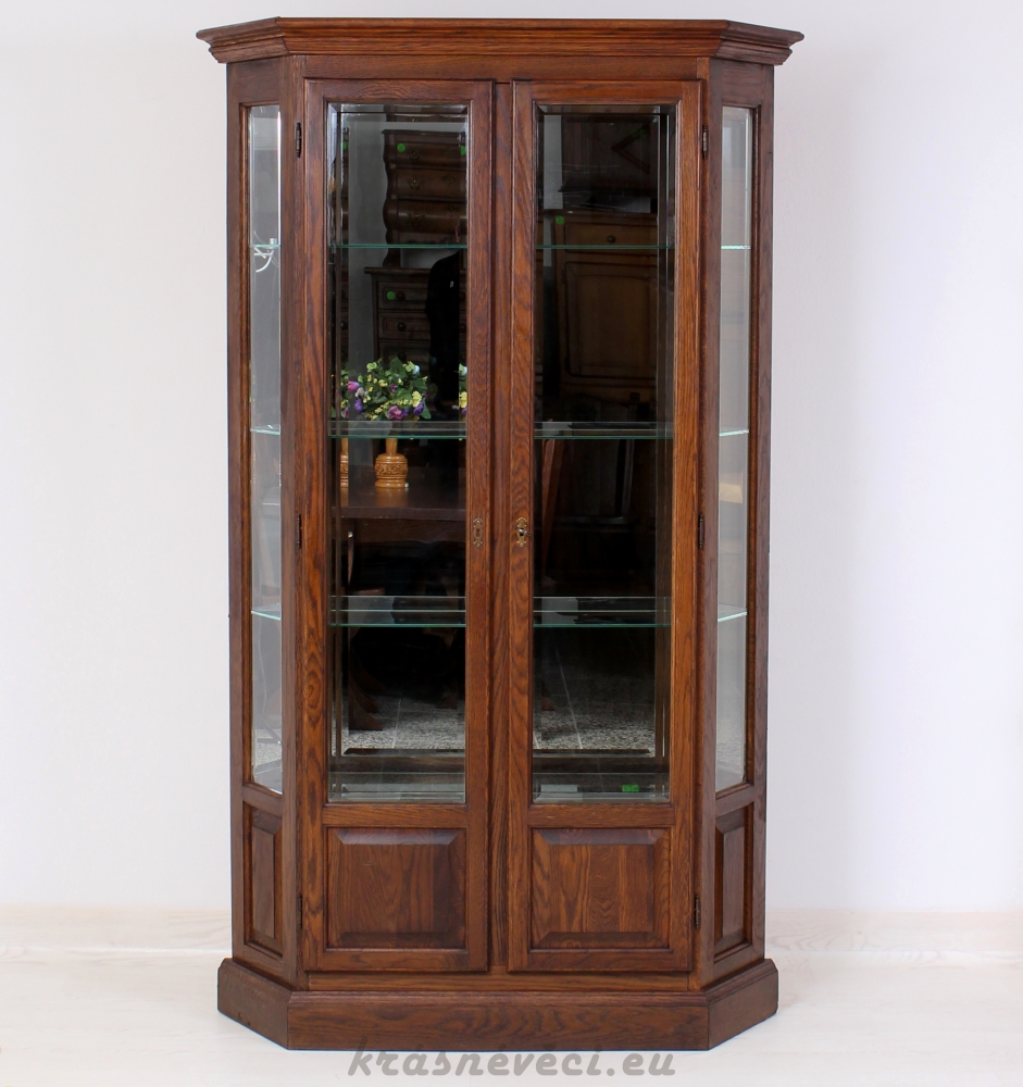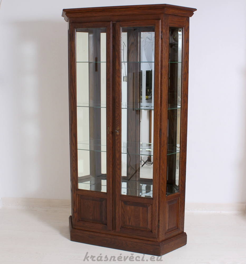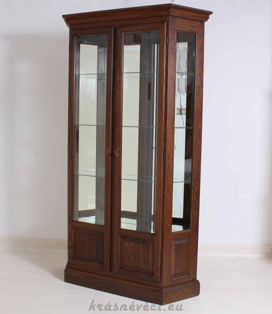 Velmi pěkná exklusivní dubová vitrína, 2x dvířka zamykací se sklem s broušenými hranami, 2x boční skla s broušenými hranami, vnitřní osvětlení, 4x skleněné police, zrcadlo.