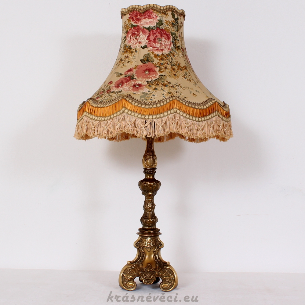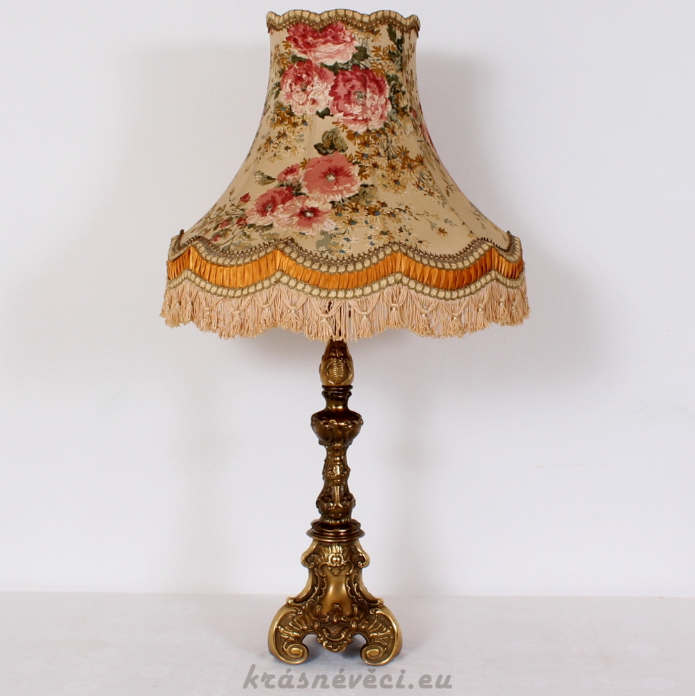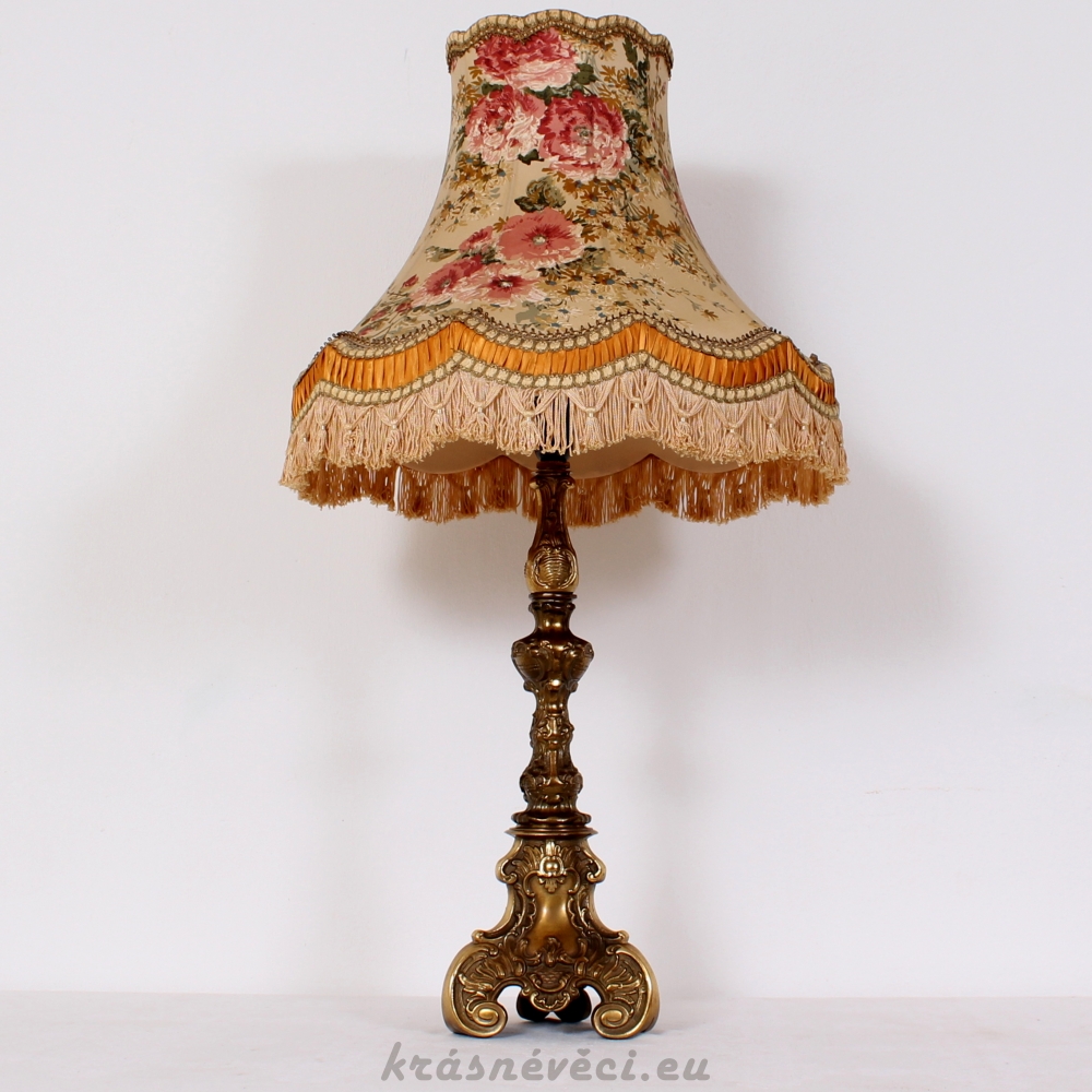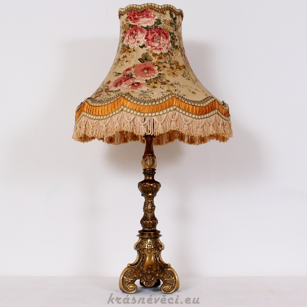 Velmi pěkná exklusivní velká stolní stylová lampa s mohutnou zdobenou mosaznou konstrukcí a zajímavým stínidlem s květy.