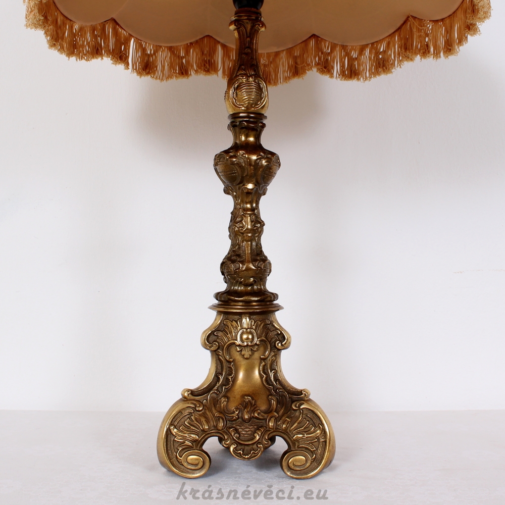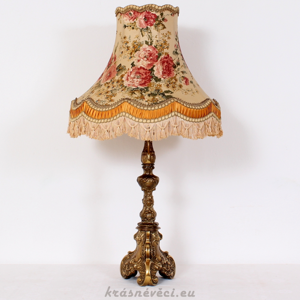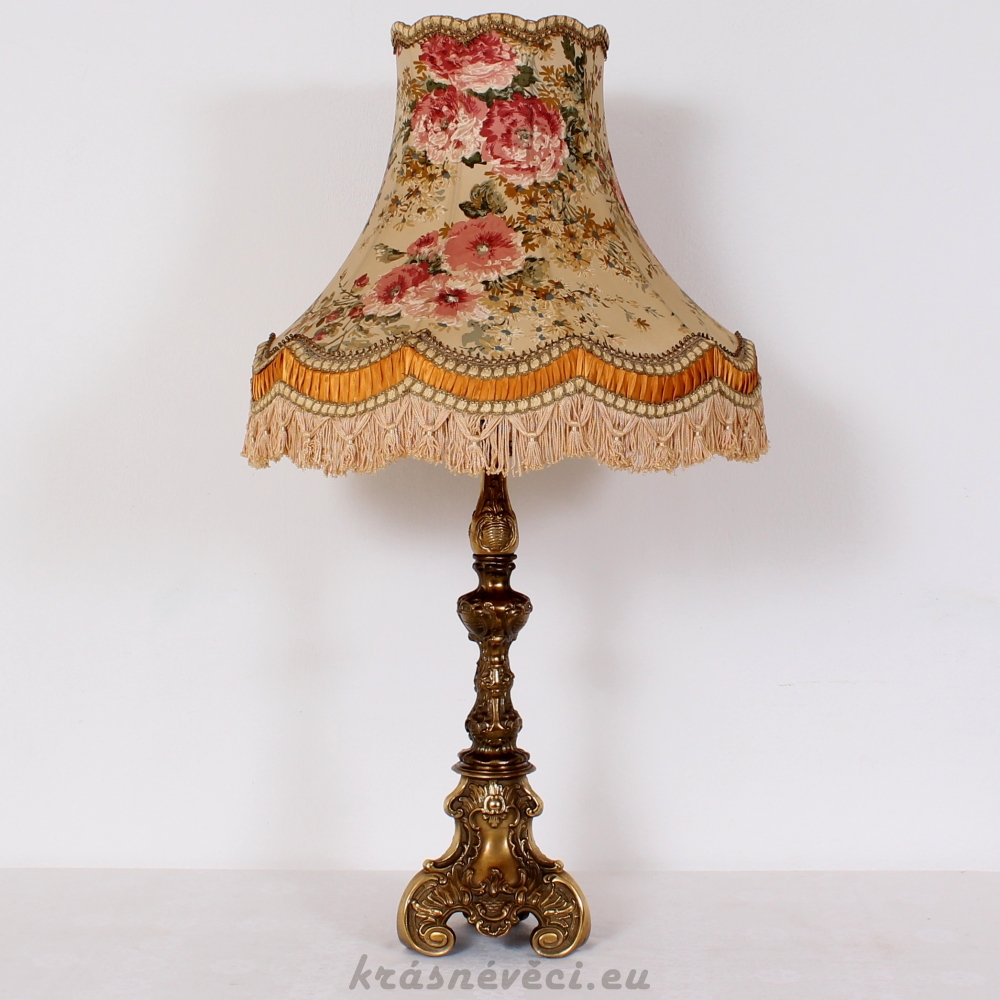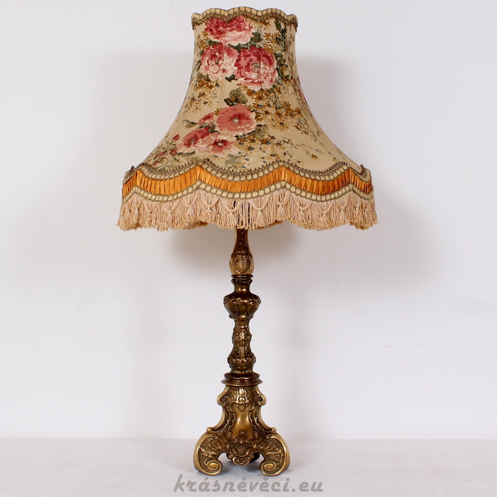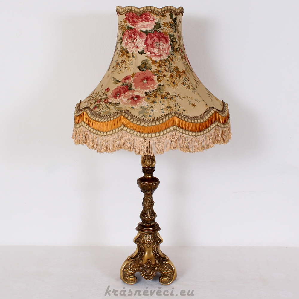 Velmi pěkná exklusivní velká stolní stylová lampa s mohutnou zdobenou mosaznou konstrukcí a zajímavým stínidlem s květy.