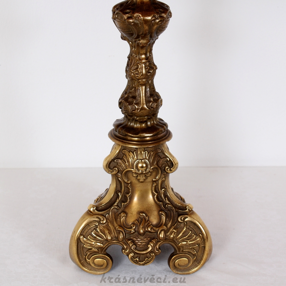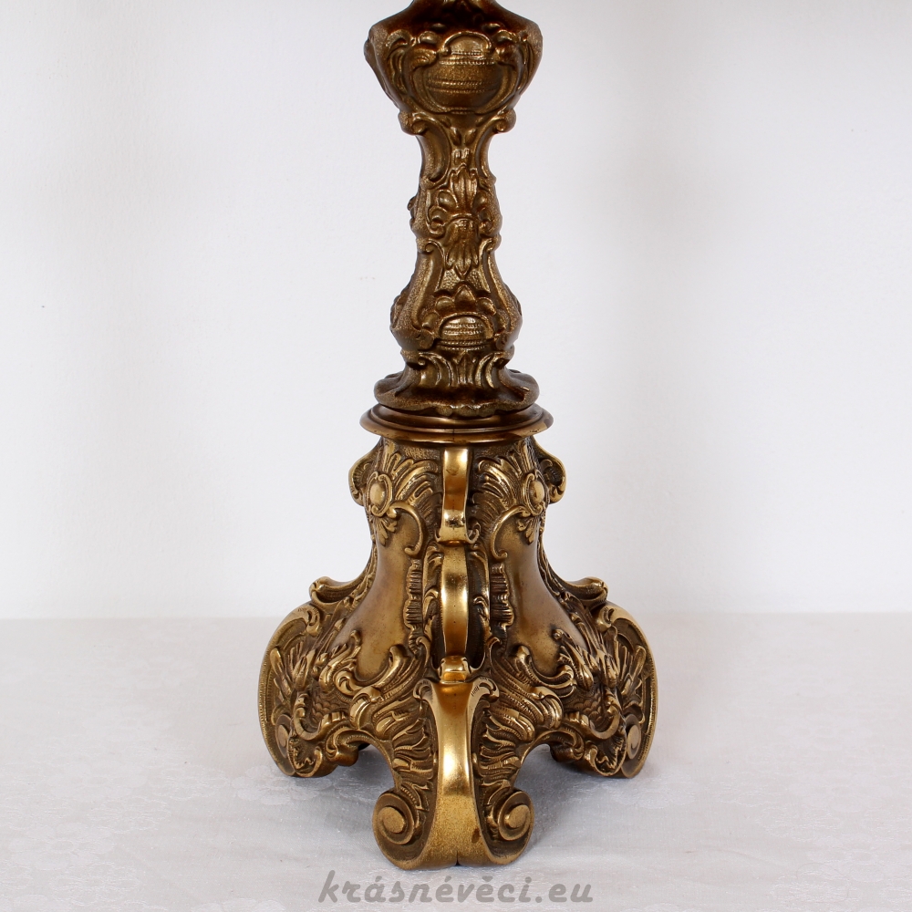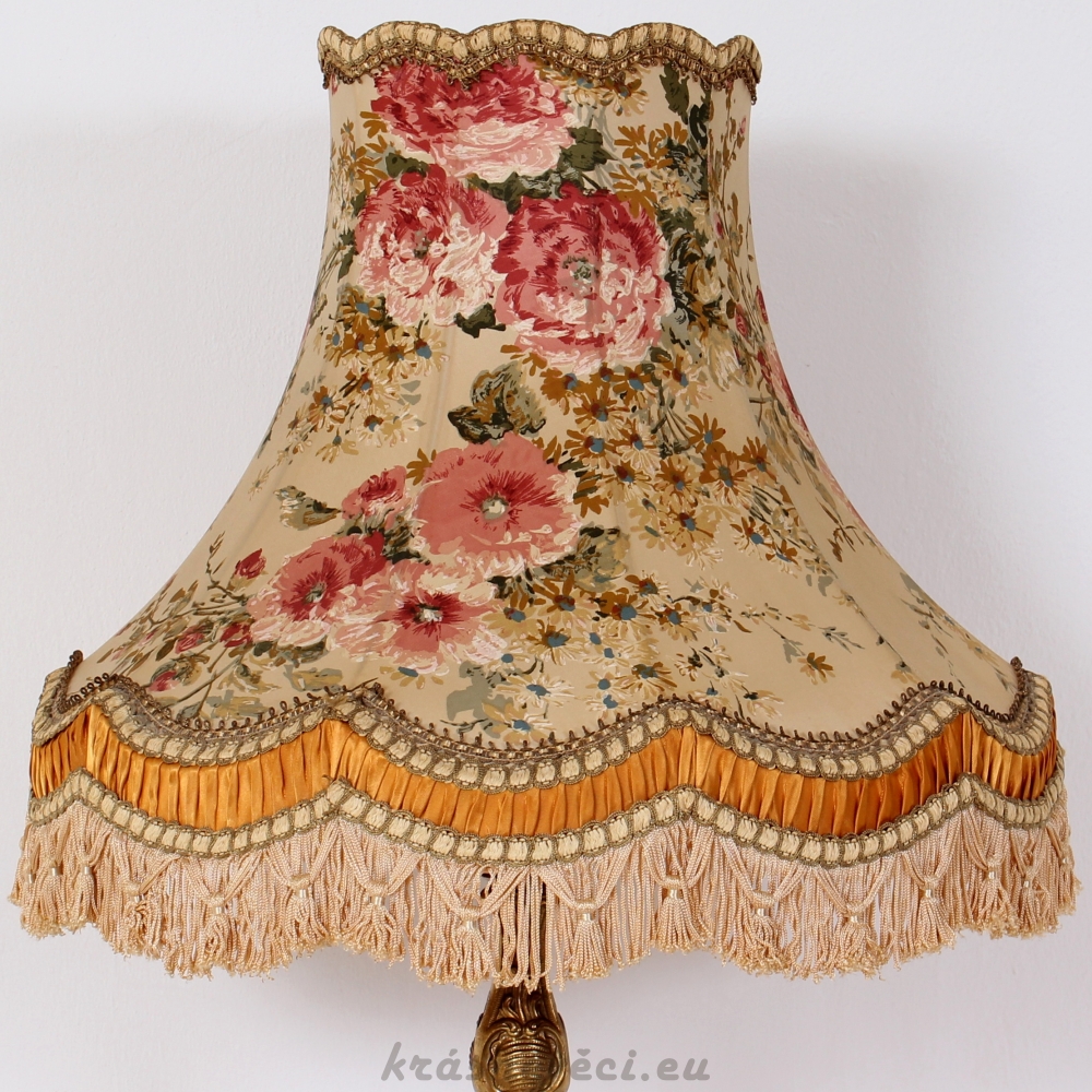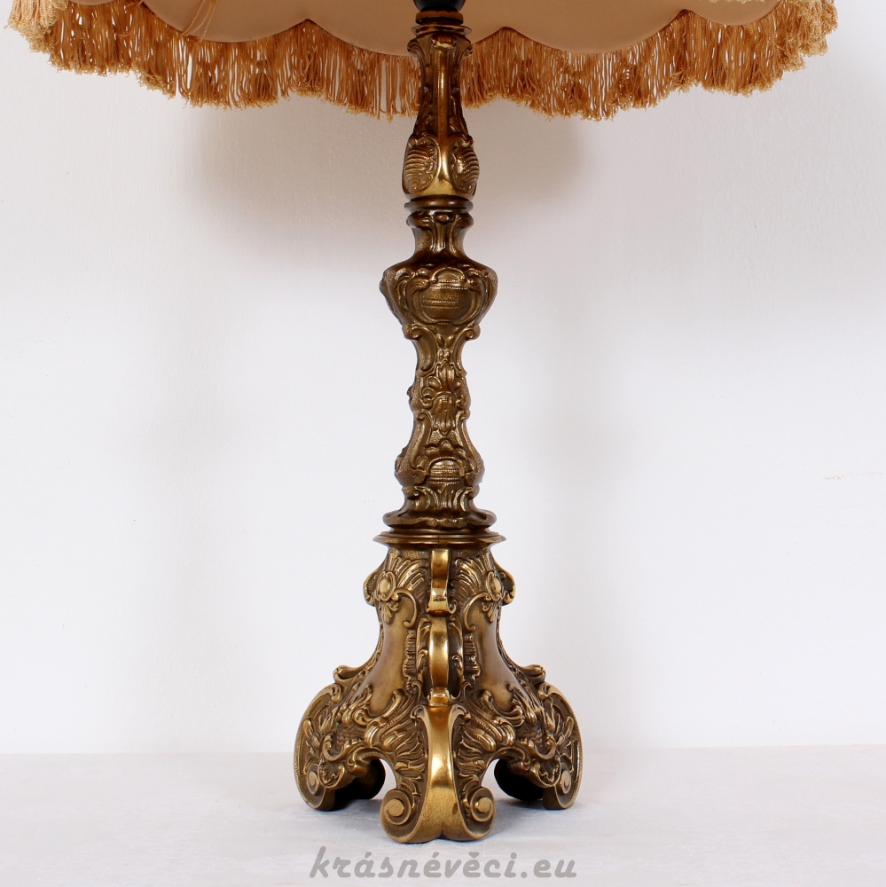 Velmi pěkná exklusivní velká stolní stylová lampa s mohutnou zdobenou mosaznou konstrukcí a zajímavým stínidlem s květy.