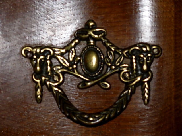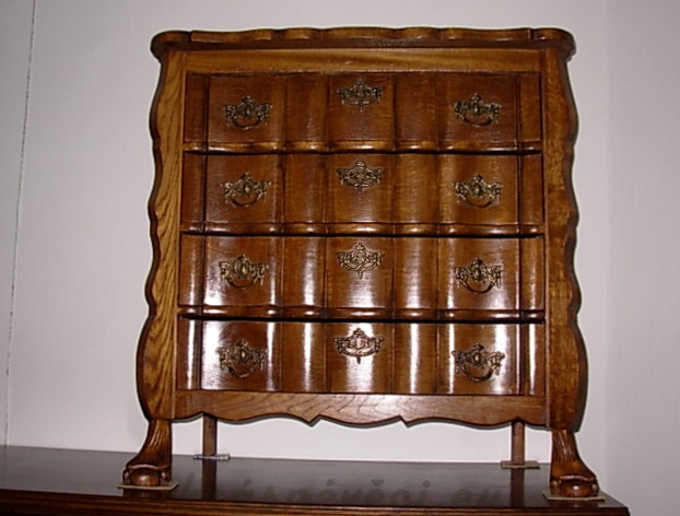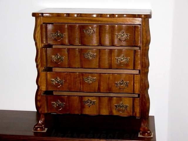 Velmi pěkná šuplíková komoda se zdobením na 4 nožkách se 4 šuplíky a mosazným kováním.